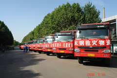 2008年5月30日,我公司選派3公司10臺(tái)豪沃8X4自卸車,承擔(dān)了太鋼支援甘肅地震災(zāi)區(qū)700頂帳篷等物資的緊急運(yùn)送任務(wù)。