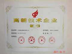 2011年7月12日,經(jīng)山西省科技廳、省財(cái)政廳、省國稅局、省地稅局組成的山西省高新技術(shù)企業(yè)認(rèn)定管理機(jī)構(gòu)批準(zhǔn),我公司被認(rèn)定為高新技術(shù)企業(yè)。