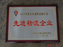 2012年2月8日,在山西省道路運(yùn)輸工作會(huì)議上,我公司獲得由山西省交通運(yùn)輸管理局頒發(fā)的2011年度全省道路運(yùn)輸行業(yè)《先進(jìn)物流企業(yè)》榮譽(yù)稱號(hào)。