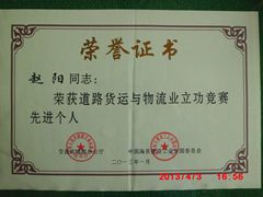 2013年4月2日,公司董事長趙陽在“道路貨運(yùn)與物流業(yè)立功競賽”活動(dòng)中,被交通運(yùn)輸部辦公廳和中國海員建設(shè)工會(huì)全國委員會(huì)聯(lián)合授予“先進(jìn)個(gè)人”榮譽(yù)稱號(hào)。